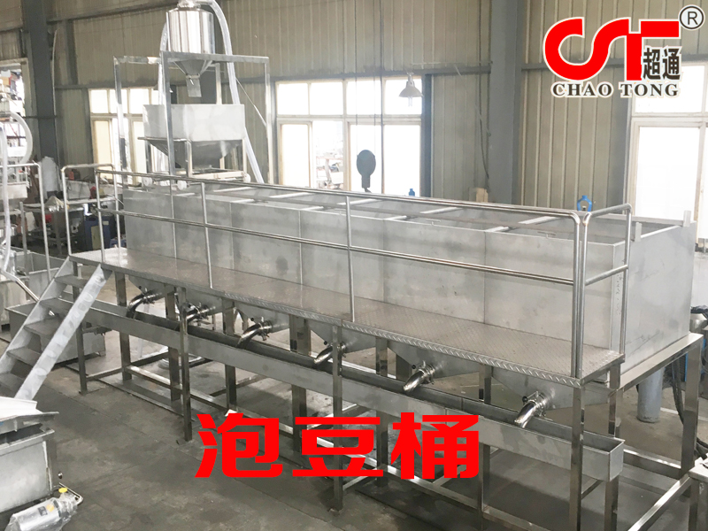 生產流程 :將黃豆送入泡豆槽中加水浸泡,通過一定時間的浸泡使豆粒吸水膨脹,有利于黃豆磨制粉碎后充分提取其中的蛋白質。 根據氣溫變化,黃豆質量,生產速度準確掌握浸豆時間。一般春、秋季氣溫在10-12℃,浸泡時間12-15小時;夏季氣溫在28-33℃,浸泡5-7小時,冬季氣溫在15-22小時,夏季泡豆至八成熟,掰開豆瓣中心稍有凹形,中間色澤較暗,冬季可泡到九成熟,掰開豆瓣成乳白色,中心淺黃色,PH值為中性。 可選配自動浸泡系統:為了提高產品質量和得率,用現代化的科技手段,對傳統工藝進一步完善,使黃豆能在浸泡后的時間里進行磨碎、燒煮,同時也減少人力,減輕工人勞作強度,減少人為地隨意性,便于廠方制定規范化操作要求,保證成品的質量品質 1、黃豆由儲料倉經電控閥放入稱料桶計量 2、稱量桶(小車)由電機驅動達每個浸泡桶自動放豆,可多次重復、計量設定。 3、浸泡桶設自動程序進水、放水,水位限止。根據客戶不同要求加設沖氣翻滾,黃豆多次過水沖洗。自動放豆、溫水浸泡等。 4、放水指,浸泡好的黃豆水應放掉后,再加如清潔的水沖洗,然后連水帶豆進入淌槽,去石、去鐵,再次瀝水后磨漿。